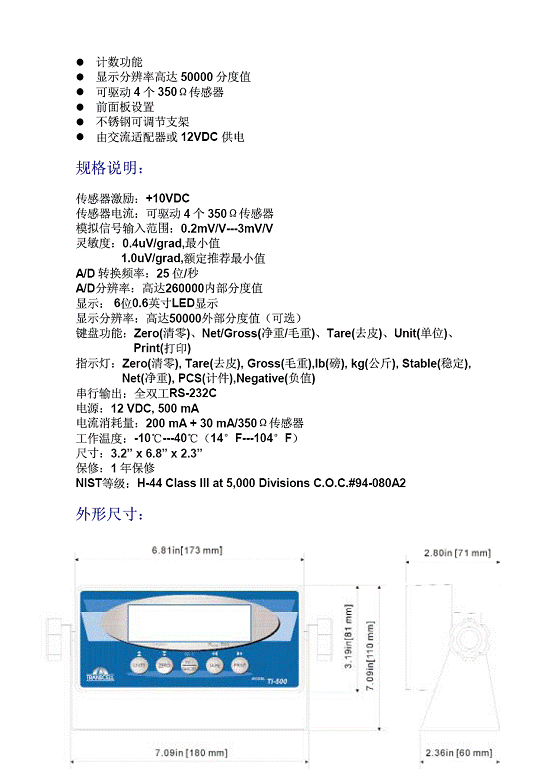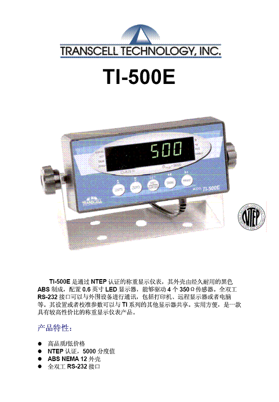 產(chǎn)品名稱:Transcell T1-500E 稱重顯示儀表(Indicator)