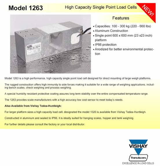 描述:1263是為大尺寸平臺秤設(shè)計(jì)的直接安裝的高性能高量程單點(diǎn)式傳感器。這個(gè)結(jié)構(gòu)保障了高的抗偏載能力,使得1263有廣泛的應(yīng)用領(lǐng)域,包括臺秤、分選秤、吊掛式電子秤和過程稱重。