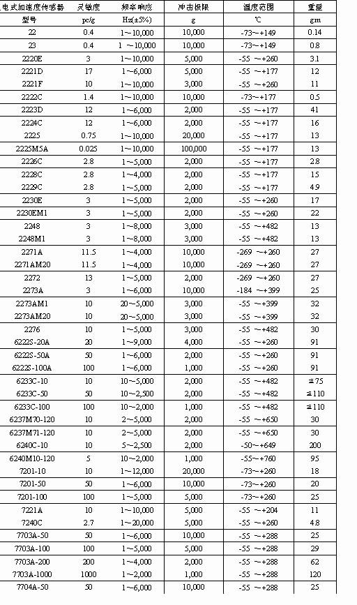 電式加速度傳感器  型號(hào)   22   23   2220E   2221D   2221F   2222C   2223D   2224C   2225   2225M5A   2226C   2228C   2229C   2230E   2230EM1   2248   2248M1   2271A   2271AM20   2272   2273A   2273AM1   2273AM20   2276   6222S-20A   6222S-50A   6222S-100A   6233C-10   6233C-50   6233C-100   6237M70-120   6237M71-120   6240C-10   6240M10-120   7201-10   7201-50   7201-100   7221A   7240C   7703A-50   7703A-100   7703A-200   7703A-1000   7704A-50